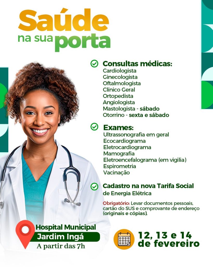 A 24ª edição do Programa Saúde na Sua Porta acontece nesta quinta, sexta e sábado, no Hospital Municipal do Jardim Ingá, com a ampliação dos serviços ofertados à população. Nesta etapa, além dos atendimentos já tradicionais, o programa passa a contar também com consultas nas especialidades de angiologia, mastologia e otorrinolaringologia.